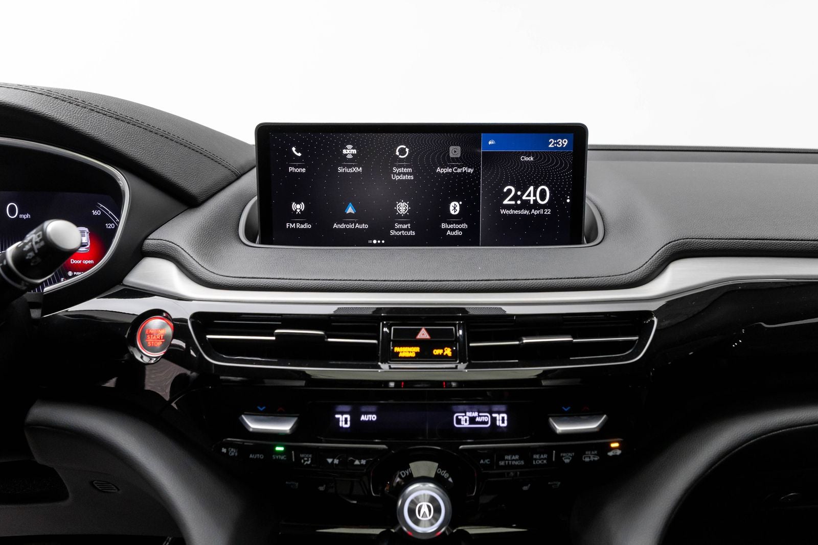 - Radio: Sistema de audio Acura Premium AM/FM, que incluye: 9 altavoces, pantalla central HD de 12,3" con doble contenido y interfaz True Touch, función de punto de acceso Wi-Fi, reconocimiento de voz en lenguaje natural, servicios conectados AcuraLink, servicios de seguridad y control remoto AcuraLink (3 años), compatibilidad inalámbrica con Apple CarPlay y Android Auto, Alexa integrada, radio HD, radio por satélite SiriusXM (SiriusXM requiere una suscripción tras cualquier periodo de prueba; si decide continuar con el servicio SiriusXM al finalizar su suscripción de prueba, el plan que elija se renovará automáticamente y se facturará según las tarifas vigentes en ese momento hasta que llame a SiriusXM al 1-866-635-2349 para cancelarlo; consulte nuestro Acuerdo con el cliente para conocer los términos completos en www.siriusxm.com, Las tarifas y la programación están sujetas a cambios. Disponible en los 48 estados contiguos de EE. UU. y en D. C. SiriusXM y todas las marcas y logotipos relacionados son marcas comerciales de SiriusXM Radio Inc.), interfaz de audio USB, interfaz de teléfono inalámbrico Bluetooth® HandsFreeLink con transmisión de audio y compensación de volumen sensible a la velocidad (SVC)